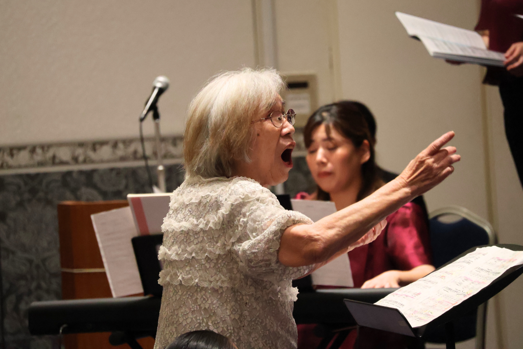 乾杯に続き、OBOG合唱団による合唱も披露されました。当時指揮を務められていた有川サチ子先生が再び指揮をとり、心温まる歌声で会場を包みました。