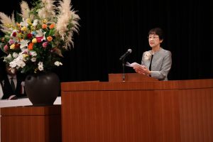 からご祝辞をいただき、その後、本学同窓会しのぶ会会長 廣池 直美 様の乾杯のご発声で会が和やかに開宴しました。