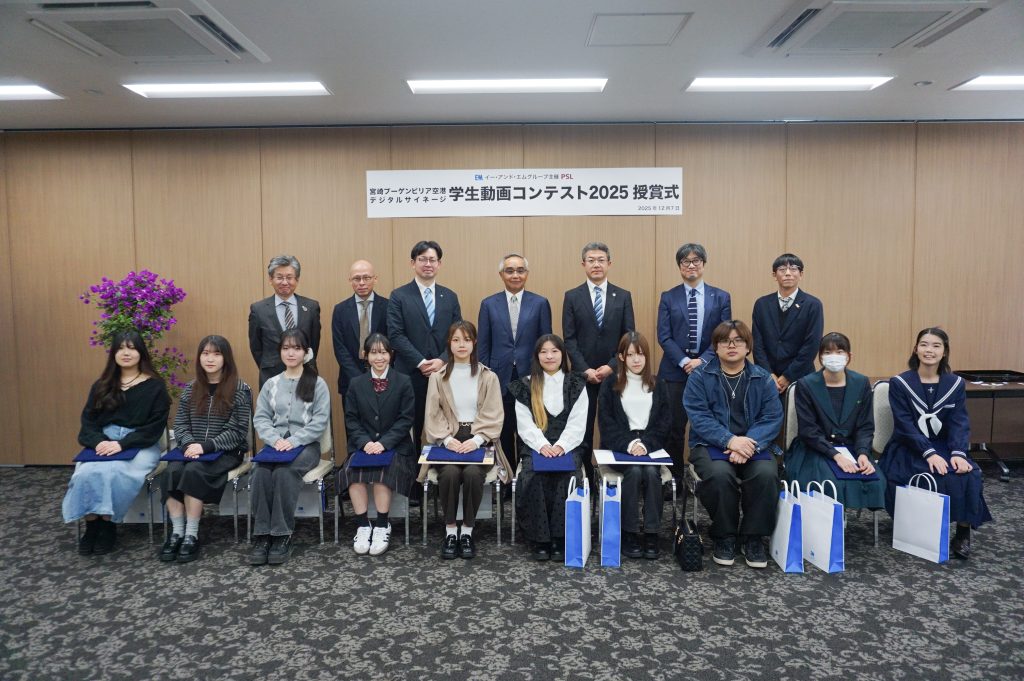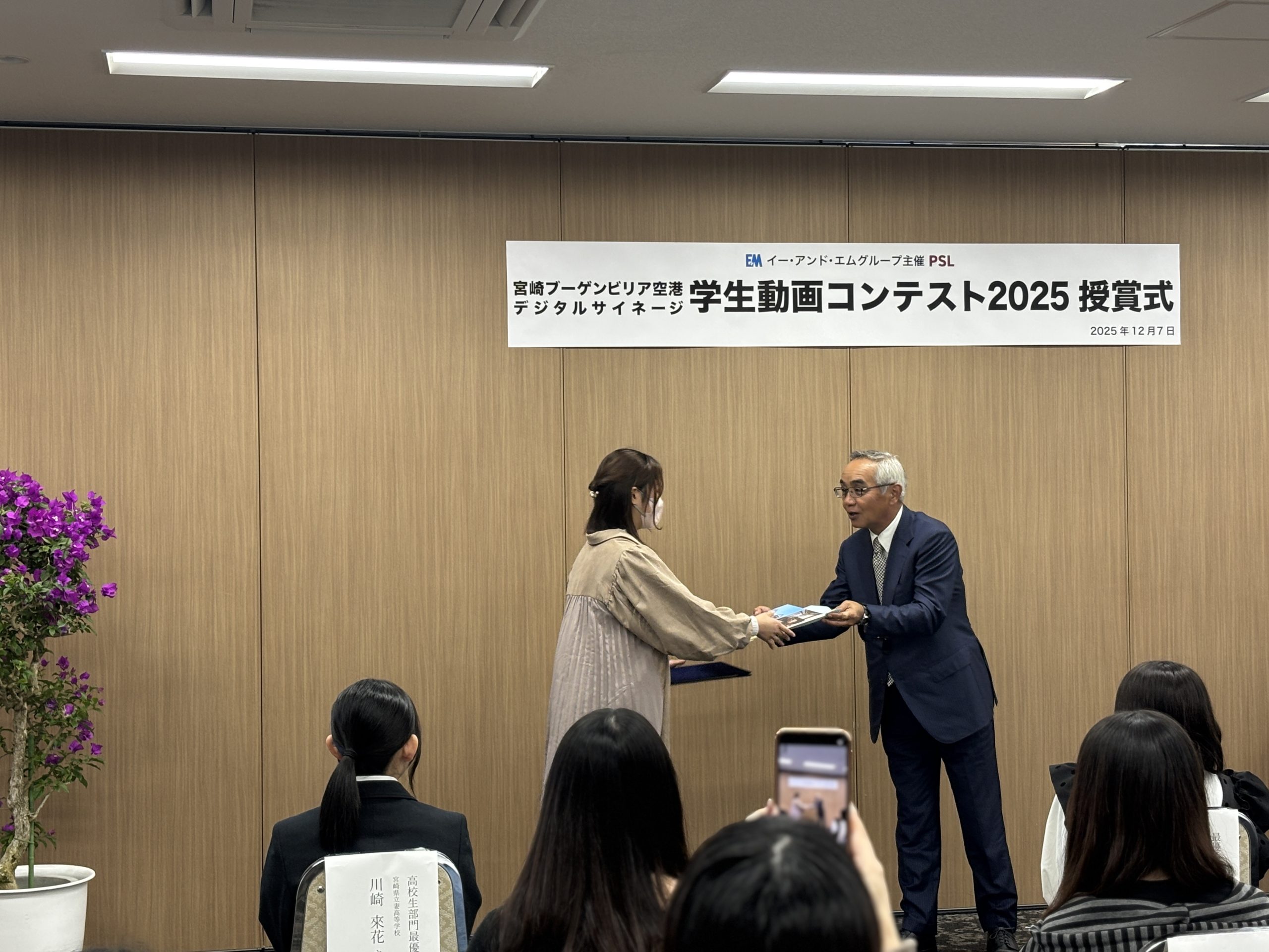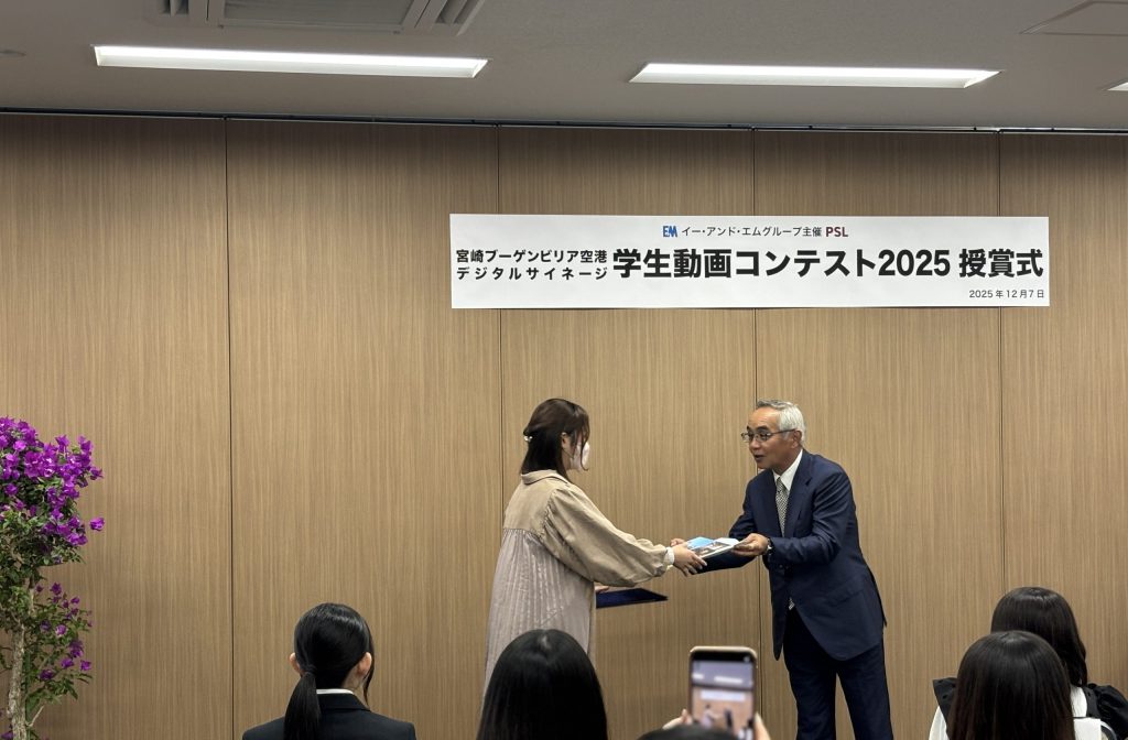 2025年12月8日に開催された「イー・アンド・エム主催 宮崎ブーゲンビリア空港 デジタルサイネージ学生動画コンテスト2025」授賞式において、本学・現代ビジネス科の1年 谷山 美心さんが優秀賞(ケイメイ賞)、1年 加賀 小友季さんが入選を受賞しました。