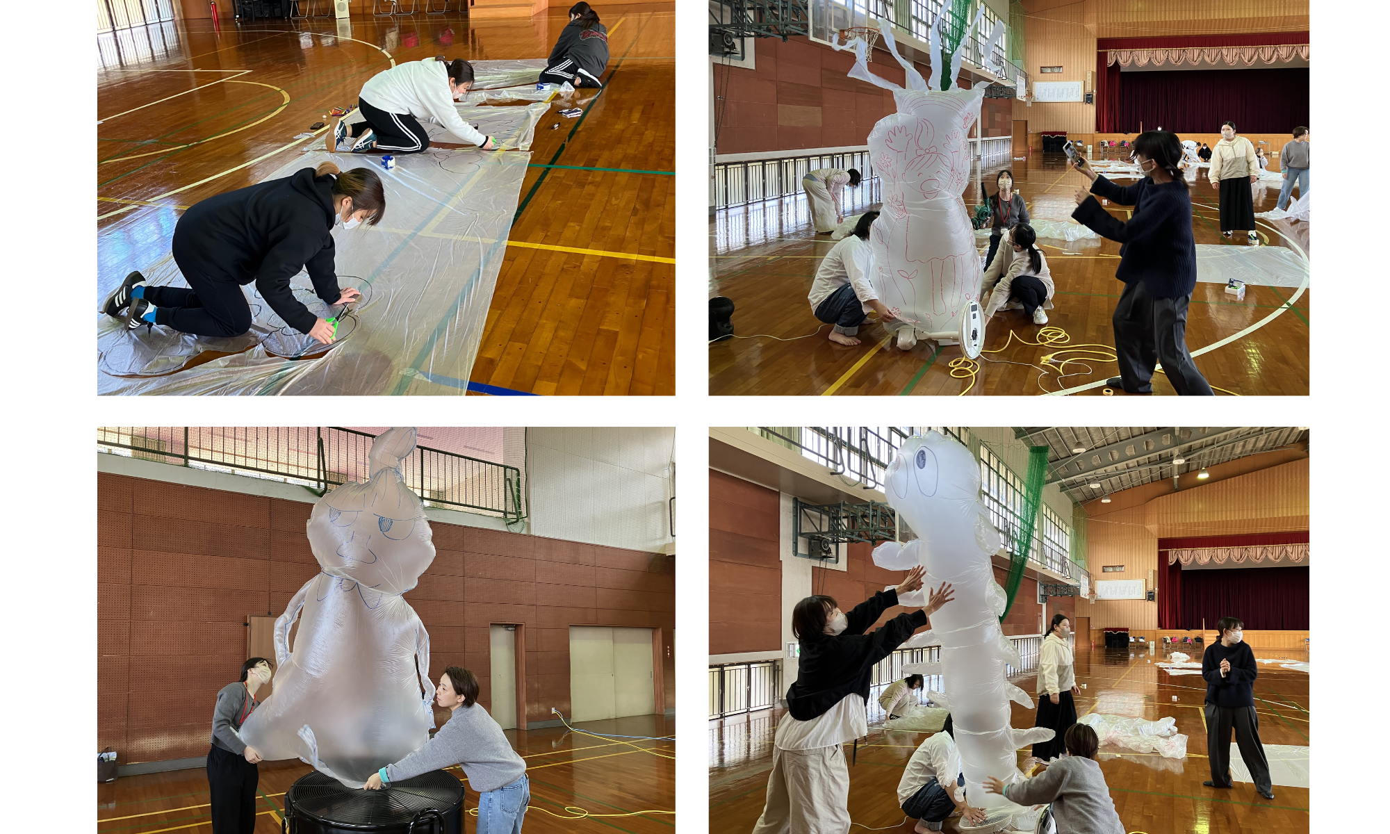 まず挑戦したのは、養生ビニールシートを長くつなげて大きな筒状にする活動。