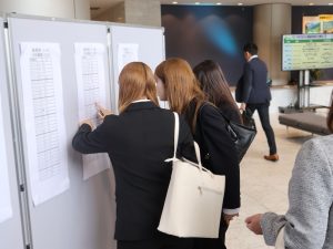 掲示板に掲示されたクラス編成に見入る新入生たち。これから始まる新しい日々に期待を膨らませている様子が印象的でした。