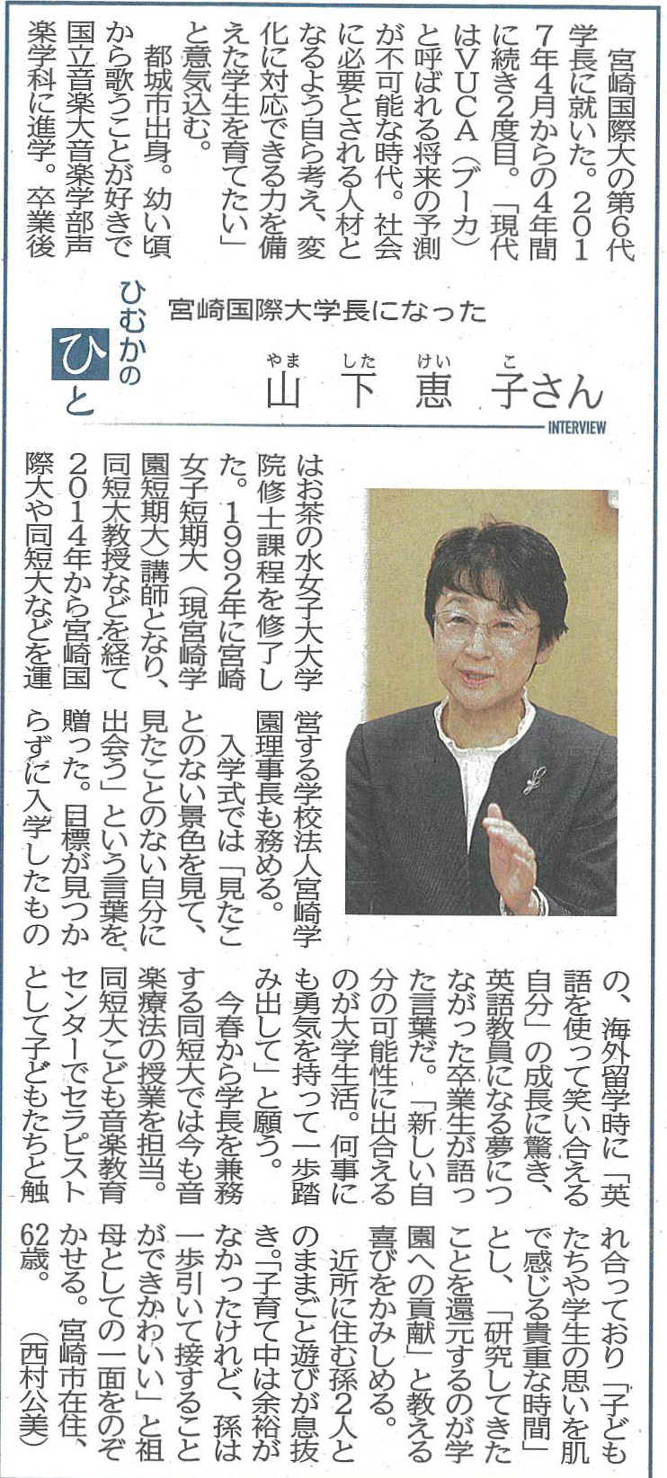 NIE(新聞を教育現場で活用する取組)について、本学の山下忍学長が自らの体験に基づいた考えを綴られた寄稿文が宮崎日日新聞に掲載されました。
