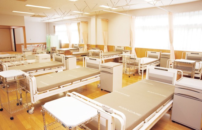 介護技術実習に必要なベッドや車椅子、入浴介護実習用浴槽やシャワーなどの設備が整えられています。