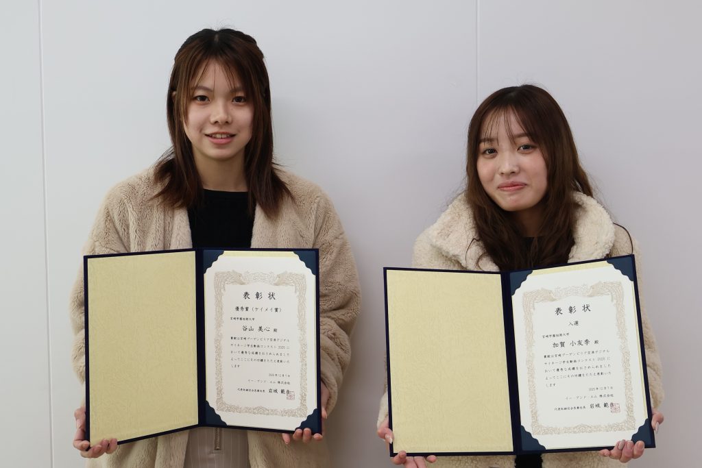 2025年12月8日に開催された「イー・アンド・エム主催 宮崎ブーゲンビリア空港 デジタルサイネージ学生動画コンテスト2025」授賞式において、本学・現代ビジネス科の1年 谷山 美心さんが優秀賞(ケイメイ賞)、1年 加賀 小友季さんが入選を受賞しました。