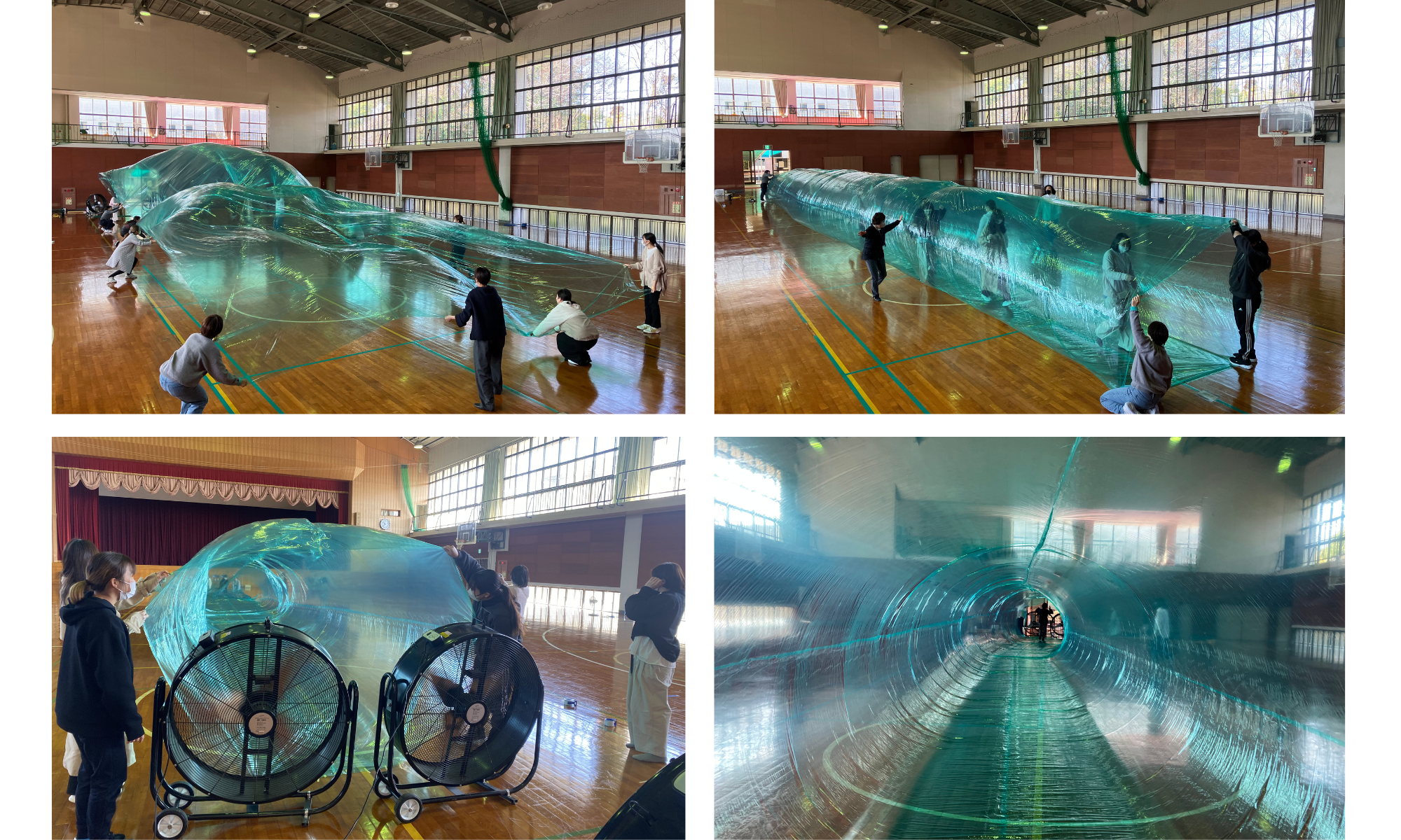 そこへ大型扇風機で風を送り込むと…ふわり、ふくらみ、やがて巨大なトンネルに!